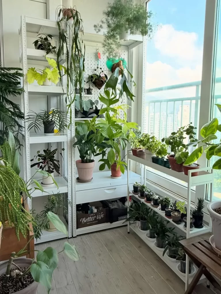 This corner features a well-organized plant display using white metal shelving units that maximize vertical space. The setup resembles a personal greenhouse with dozens of small to medium plants arranged at different heights. The large windows provide abundant natural light, creating an ideal environment for plant growth while offering a beautiful view of the urban landscape beyond.