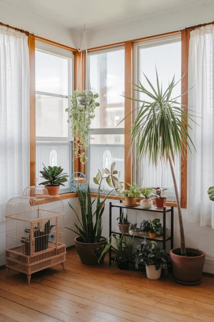 This sun-drenched corner window creates an ideal plant sanctuary. A tall dracaena serves as the centerpiece, while a vintage birdcage adds whimsical character. Multiple plant stands at varying heights create visual interest, with snake plants, small palms, and trailing varieties filling the space. The hanging planter in the window corner maximizes the vertical space, while the natural wood floors and window frames provide warmth to the abundant greenery.