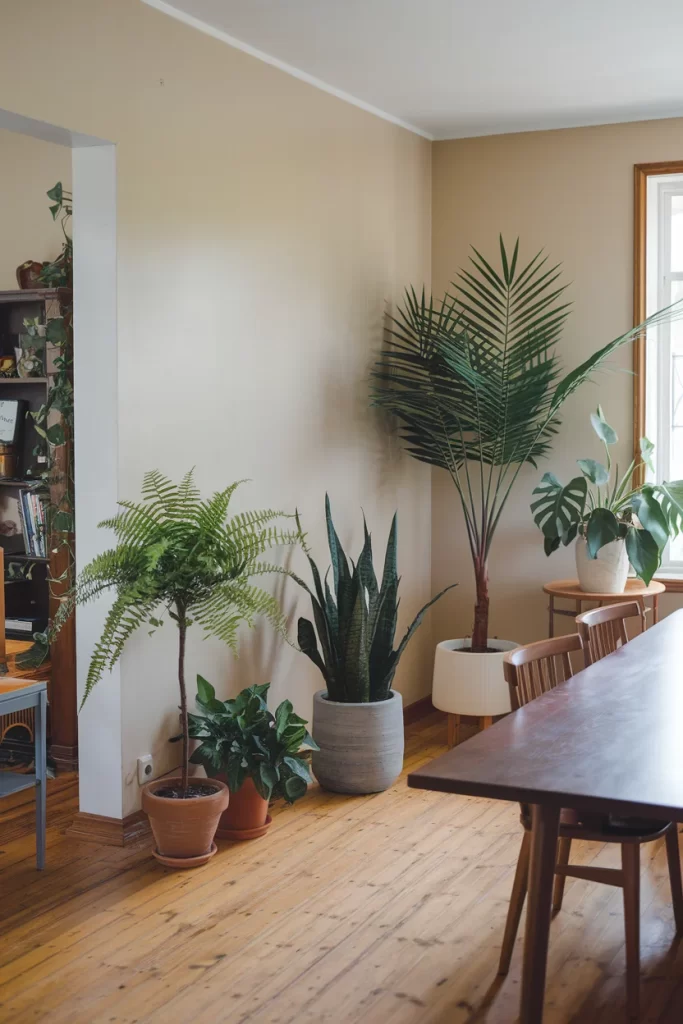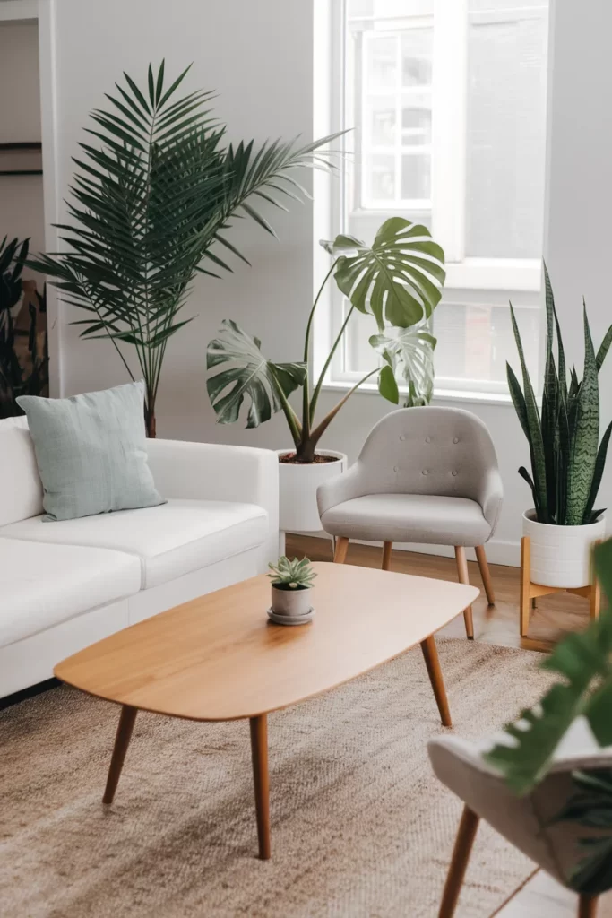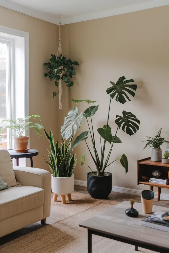 Clean-lined mid-century furniture pairs beautifully with carefully selected plants. A large palm tree and monstera provide tropical flair, while a snake plant in a white planter maintains the room’s geometric aesthetic. The neutral furniture allows the plants to serve as living artwork, and the varied plant heights create visual rhythm throughout the space.