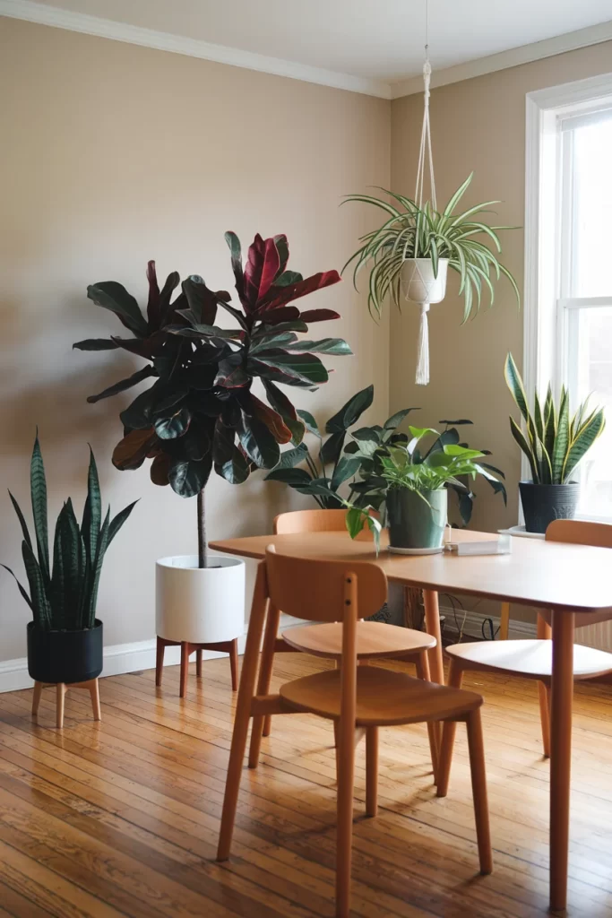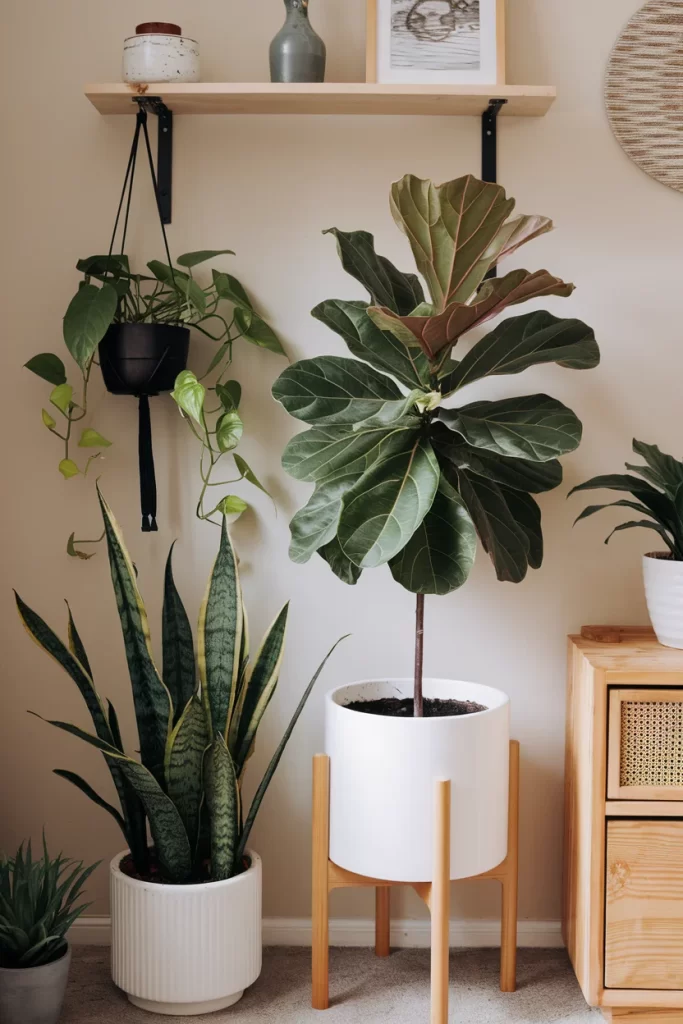 The third image features a sophisticated corner plant display centered around a tall fiddle leaf fig and snake plants. A large monstera adds tropical flair with its distinctive split leaves. The neutral wall color serves as a perfect backdrop, allowing the green foliage to pop. The wooden furniture maintains the warm, natural aesthetic throughout the space.