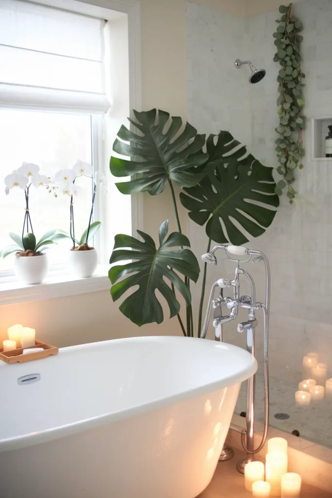 A sophisticated bathroom features a stunning monstera deliciosa as the focal point beside a freestanding white bathtub. White orchids on the windowsill add delicate beauty, while trailing eucalyptus provides texture along the shower wall. The marble surfaces and chrome fixtures create an upscale feel, while the plants soften the formal aesthetic and bring life to the space.
