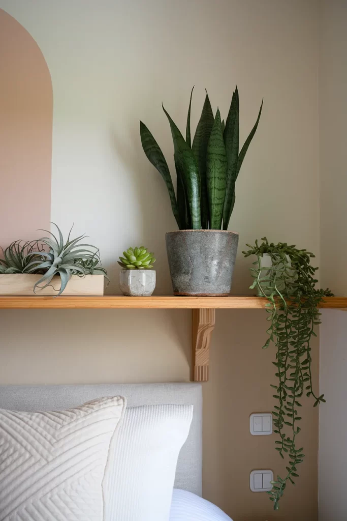 The seventh image presents a clever use of a floating shelf above a bed to create a mini indoor garden. A snake plant serves as the anchor piece, while smaller succulents and trailing plants add variety. Air plants provide unique textures without requiring soil, and the arrangement creates an interesting backdrop for the sleeping area.