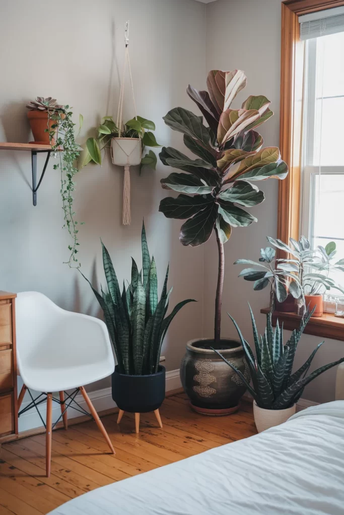 Here we see how plants can create a serene bedroom environment. A large snake plant anchors the corner while a rubber plant provides rich burgundy and green tones. The macrame hanger adds a hanging plant element above the nightstand. The combination creates a calming, natural atmosphere that promotes relaxation and better air quality in the sleeping area.