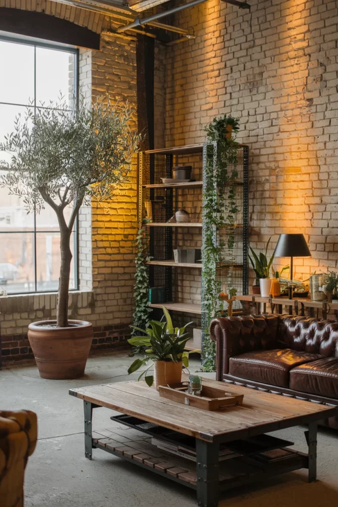 This industrial-style living room demonstrates how plants can warm up raw materials like exposed brick and steel. A large olive tree in a terracotta pot serves as a natural sculpture, while trailing plants cascade from a wire shelving unit. Various sized plants in different containers create visual layers throughout the space. The combination of leather furniture and abundant greenery balances masculine industrial elements with organic softness.