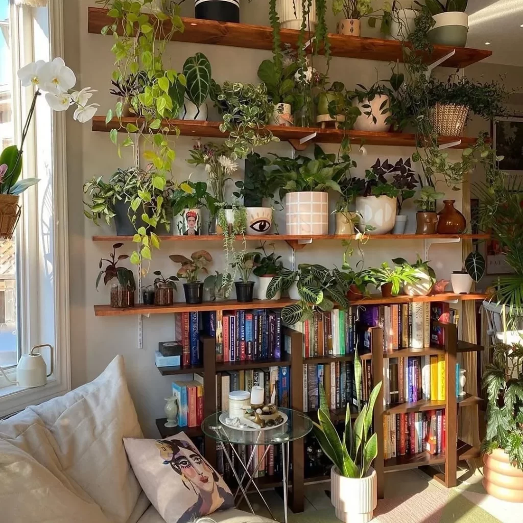This sophisticated approach combines functional shelving with plant display, creating a living library wall. Plants are interspersed among books and decorative objects, with trailing varieties adding softness to the structured wooden shelving. This demonstrates how plants can be seamlessly integrated into existing furniture and storage solutions.
