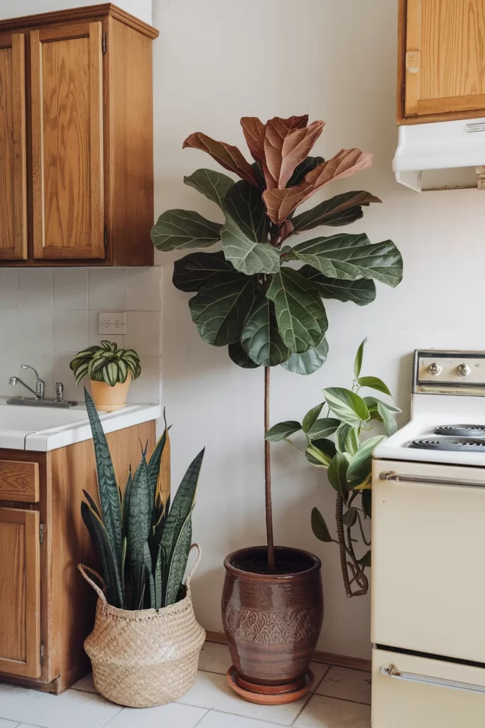 The final image shows how a kitchen corner can accommodate larger plants like a dramatic fiddle leaf fig paired with snake plants in various containers. The woven basket planter adds textural interest while maintaining the natural theme. This arrangement proves that even compact kitchen spaces can support substantial plant collections when properly planned and positioned.