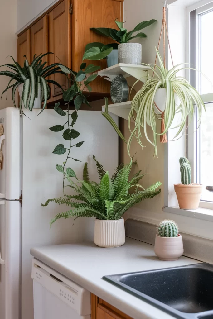 This kitchen scene demonstrates how plants can thrive in culinary spaces. The mix includes spider plants, ferns, and small cacti arranged on countertops and hanging from cabinets. The plants are strategically placed to receive adequate light from the window while staying clear of cooking areas, showing practical plant placement in functional spaces.