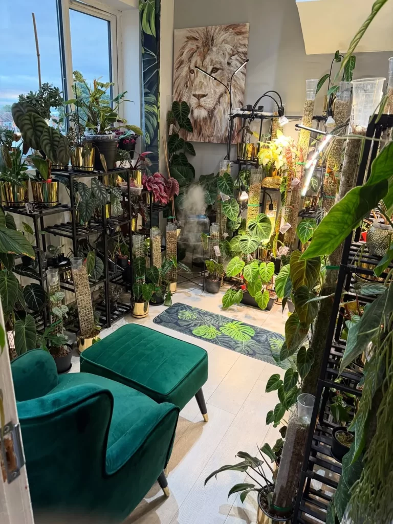 This image showcases the ultimate plant lover’s setup with floor-to-ceiling plant displays using black metal shelving systems. Grow lights supplement natural window light, allowing for an incredible density of plants. The emerald green velvet chair provides a luxurious seating spot within this verdant jungle, while a humidifier ensures optimal growing conditions.