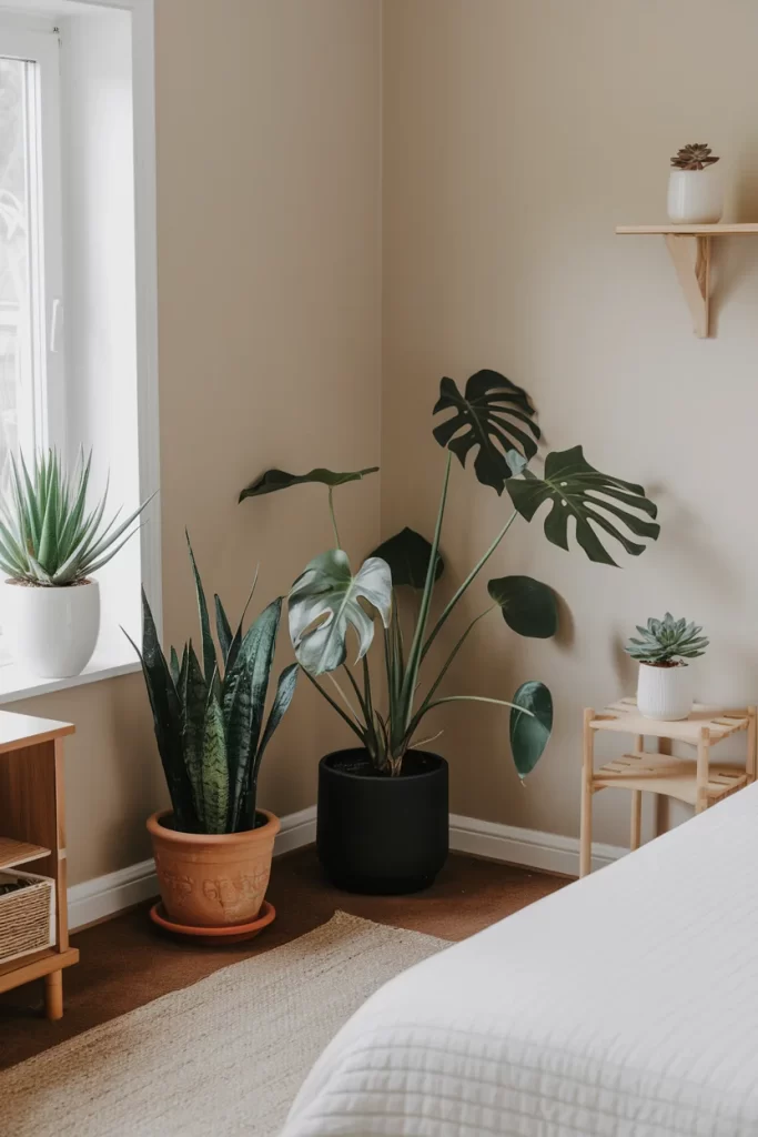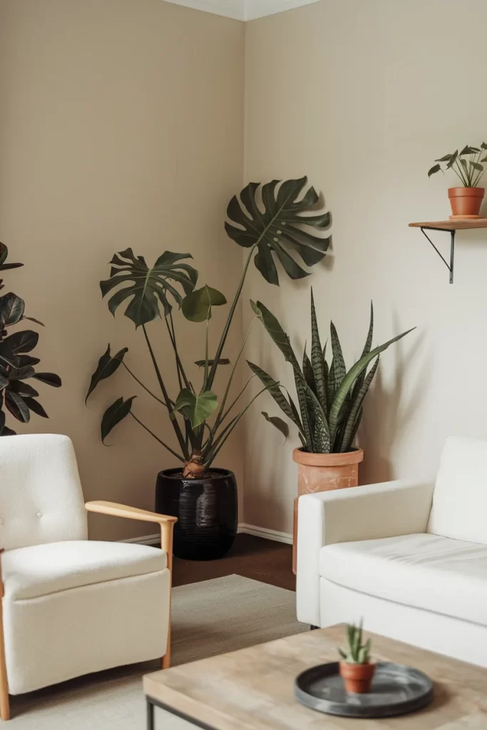 A carefully curated plant corner shows restraint in styling. A tall monstera in a black planter pairs with a snake plant in terracotta, creating height variation. The neutral color palette of beige walls and white furniture allows the plants to be the main decorative elements. This approach demonstrates how a few well-chosen plants can have significant impact without overwhelming the space.