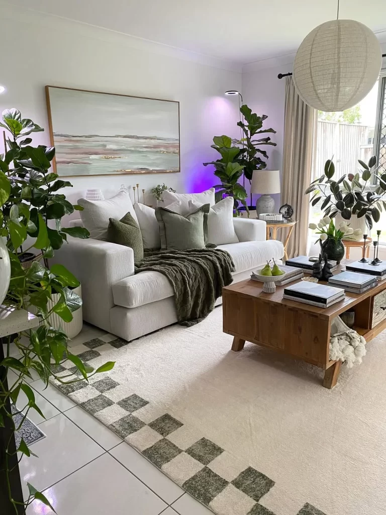 In contrast to the previous maximalist approaches, this final image shows how plants can enhance a clean, contemporary space without overwhelming it. Strategic placement of a few well-chosen plants – including a tall fiddle leaf fig and smaller potted specimens – adds life and color to the neutral-toned room while maintaining the sleek, uncluttered aesthetic.