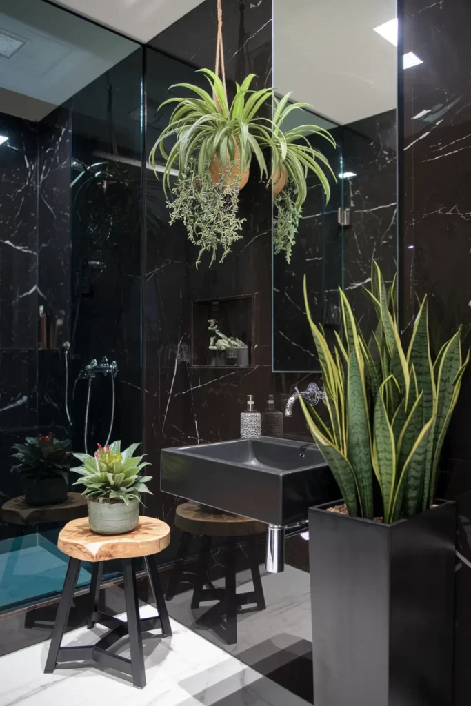 This dramatic powder room uses dark veined marble as a striking backdrop for tropical plants. A spider plant hangs gracefully from the ceiling, creating vertical interest, while a large snake plant anchors the corner. The contrast between the sleek black surfaces and lush green foliage creates visual drama. Small accent plants on wooden stools add warmth to the otherwise monochromatic space.