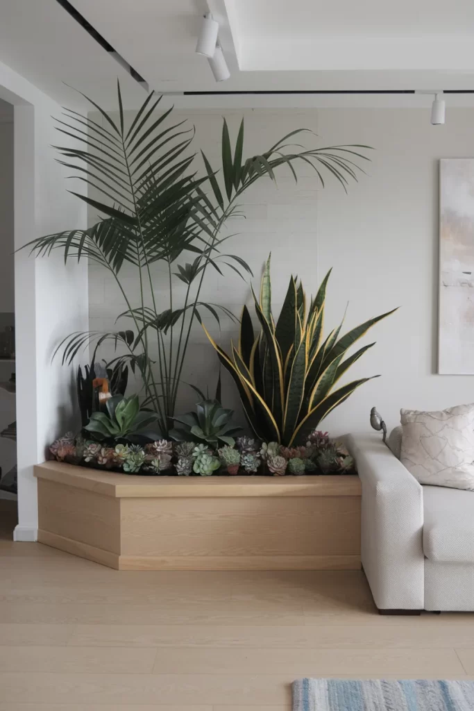 A custom wooden planter box creates a living room divider filled with carefully arranged plants. A tall palm provides structure while snake plants add vertical lines. Small succulents fill in the gaps, creating a dense, garden-like display. This built-in approach integrates plants seamlessly into the architecture, making them a permanent and substantial part of the room’s design rather than mere decoration.