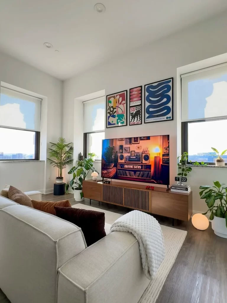 This contemporary living space features a sophisticated approach to plant styling with multiple varieties strategically placed throughout the room. Large floor plants in modern planters are positioned near windows to maximize natural light, while smaller plants accent the mid-century modern media console. The mix of plant sizes and types creates visual interest without overwhelming the clean, minimalist aesthetic.
