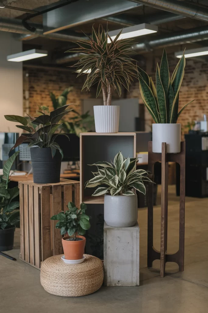 Set in what appears to be an industrial office space with exposed ceiling and brick walls, this display shows how plants can humanize commercial environments. The arrangement uses various levels created by wooden crates and plant stands to display a collection including a dramatic dracaena marginata (dragon tree), snake plants, and smaller foliage plants. The mix of planter materials—white ceramic, terracotta, and concrete—adds textural variety while maintaining a cohesive earthy palette that complements the industrial architecture.