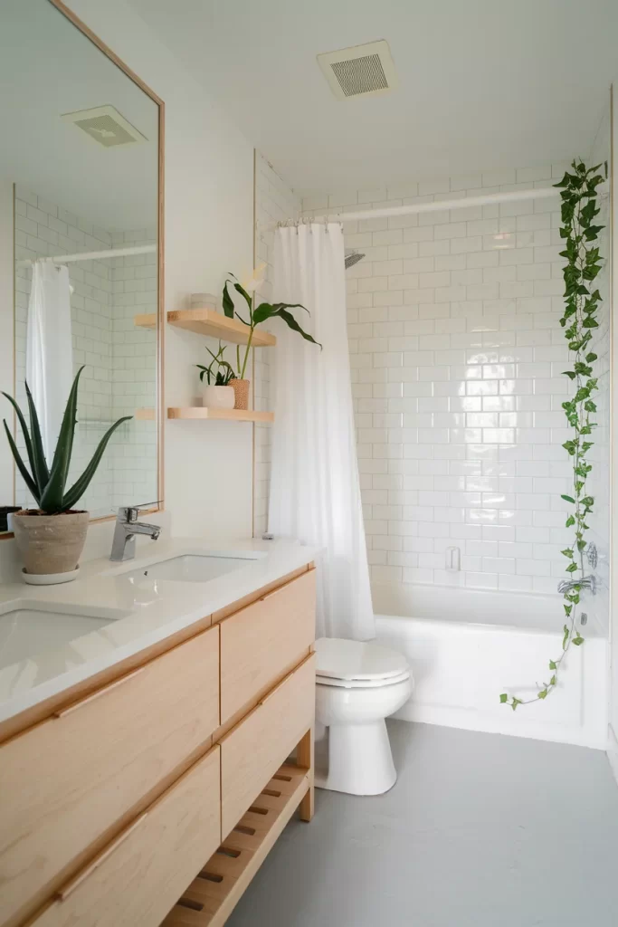 A clean, minimalist bathroom showcases how plants can soften modern design. White subway tiles provide a crisp backdrop for trailing pothos vines that drape elegantly from wooden floating shelves. A snake plant sits beside the vanity, while small potted plants add life to the space. The light wood vanity and mirror frame maintain the Scandinavian aesthetic while the plants introduce organic shapes and natural color.