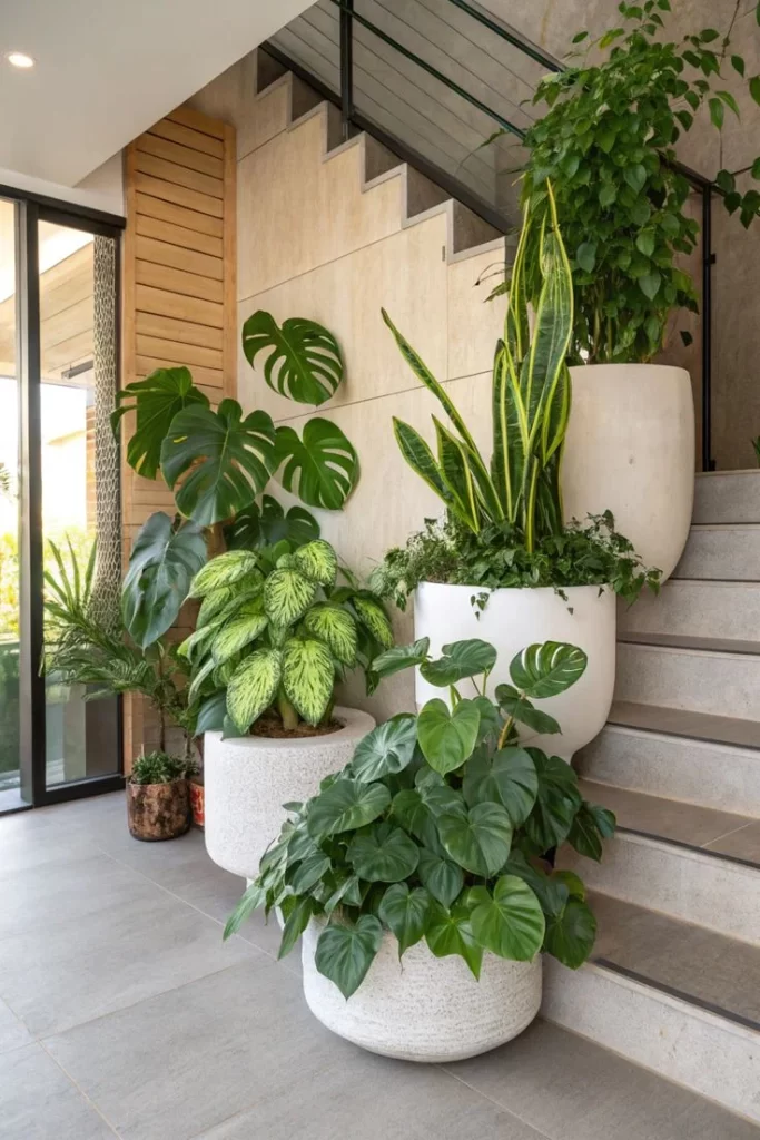 Large statement plants in neutral planters create a dramatic entrance arrangement at the base of modern stairs. The grouping includes various plant heights and textures, from tall snake plants to full monstera specimens. The concrete planters complement the contemporary architecture while the plants soften the hard edges.