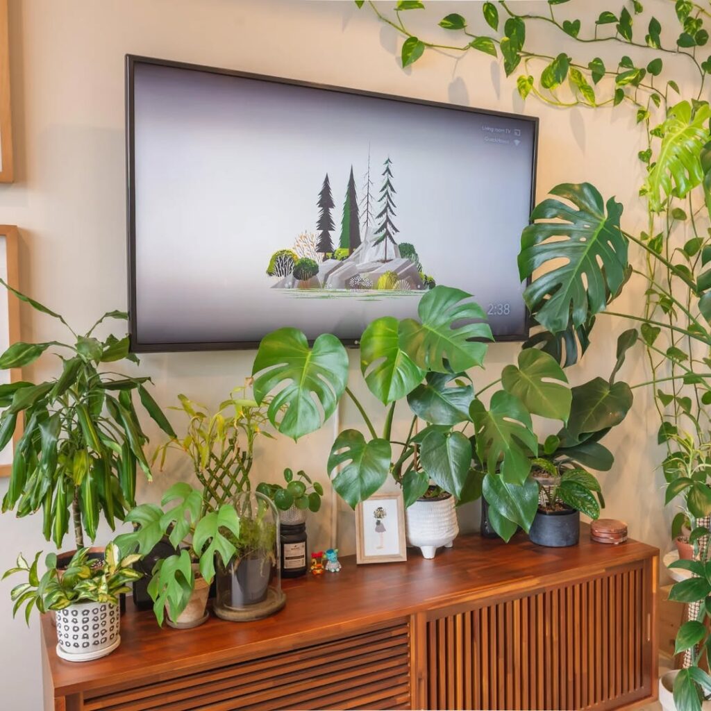 This setup transforms a media area into a green oasis with an abundance of tropical plants surrounding the television. Large monstera plants and trailing varieties create a lush backdrop, while the warm wood console provides the perfect platform for various sized planters. The arrangement demonstrates how plants can soften the harsh lines of electronics while creating a biophilic living environment.