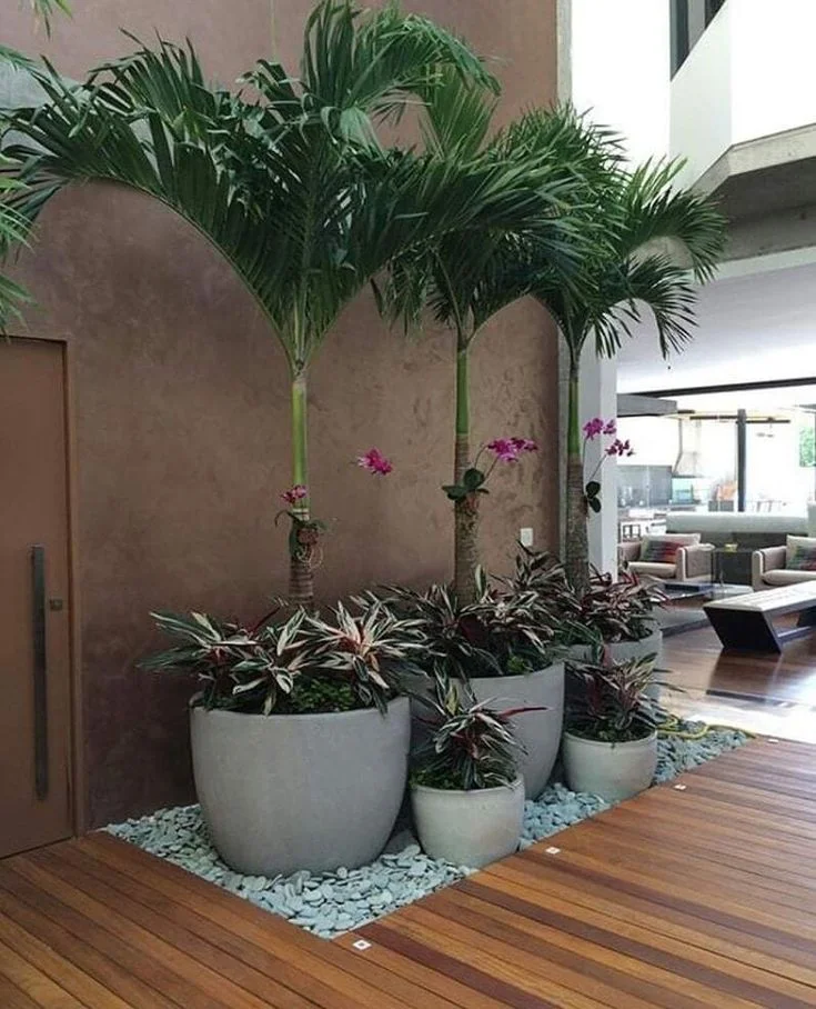 This impressive arrangement features tall palm trees as anchor pieces, creating an indoor tropical paradise. Multiple levels of planters with varying sizes house different plant varieties, from colorful bromeliads to leafy understory plants. The white pebble ground cover and modern concrete planters create a resort-like atmosphere within the home.