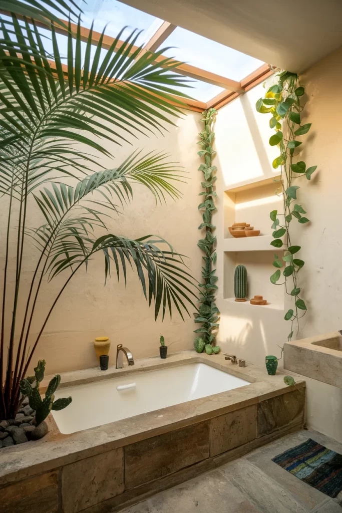 This luxurious bathroom transforms into a tropical retreat with a large palm tree as the centerpiece. The space features natural stone surfaces and a skylight that bathes the room in soft daylight. Trailing eucalyptus vines cascade down the walls, while small cacti and succulents populate built-in shelving niches. The neutral earth tones of the stone complement the vibrant green foliage, creating a serene spa-like atmosphere.