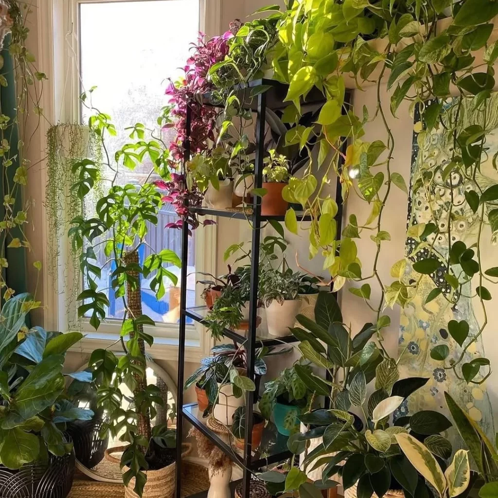 This plant-filled corner embraces the “more is more” philosophy. A wooden ladder serves as a creative plant stand, displaying trailing pothos and various succulents. A tall fiddle leaf fig dominates the space, while multiple snake plants in decorative pots (including blue ceramic and terracotta) create a lush jungle feel. The arrangement includes cacti and air plants, showing how to successfully mix different plant families in one space.