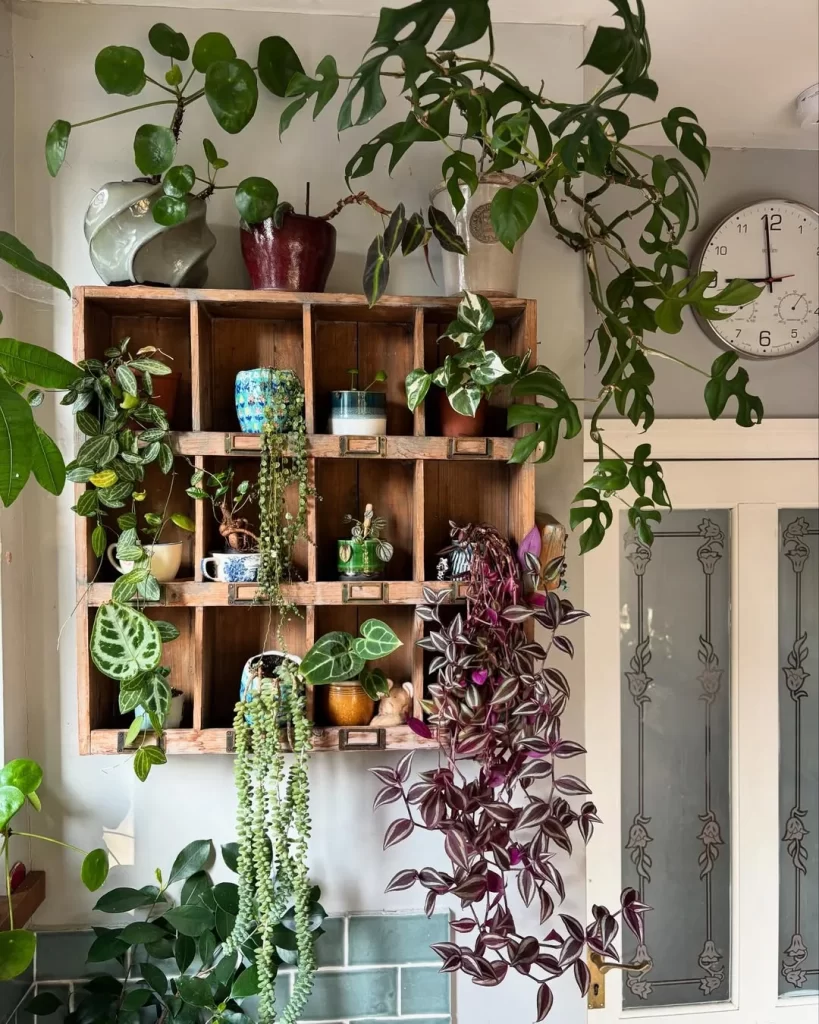 A wooden cubby shelf system serves as both decorative storage and plant display, creating an artistic living wall effect. The arrangement includes various plant types with trailing varieties that cascade from the shelves, mixed with decorative objects. This approach maximizes wall space while creating a dynamic, ever-changing display.