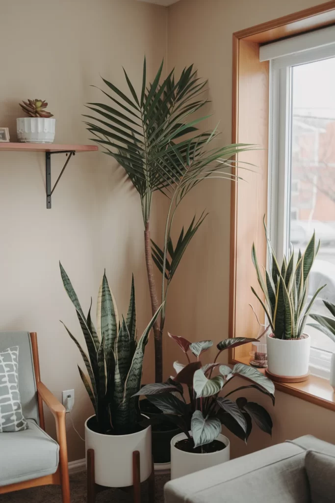 This cozy corner maximizes natural light with a thoughtful arrangement of various plants. A tall palm creates vertical drama, while multiple snake plants in matching white planters provide consistency. A small prayer plant adds variety in leaf texture and pattern. The wooden window frames and shelf create warmth, while the grouped arrangement makes a bold statement.