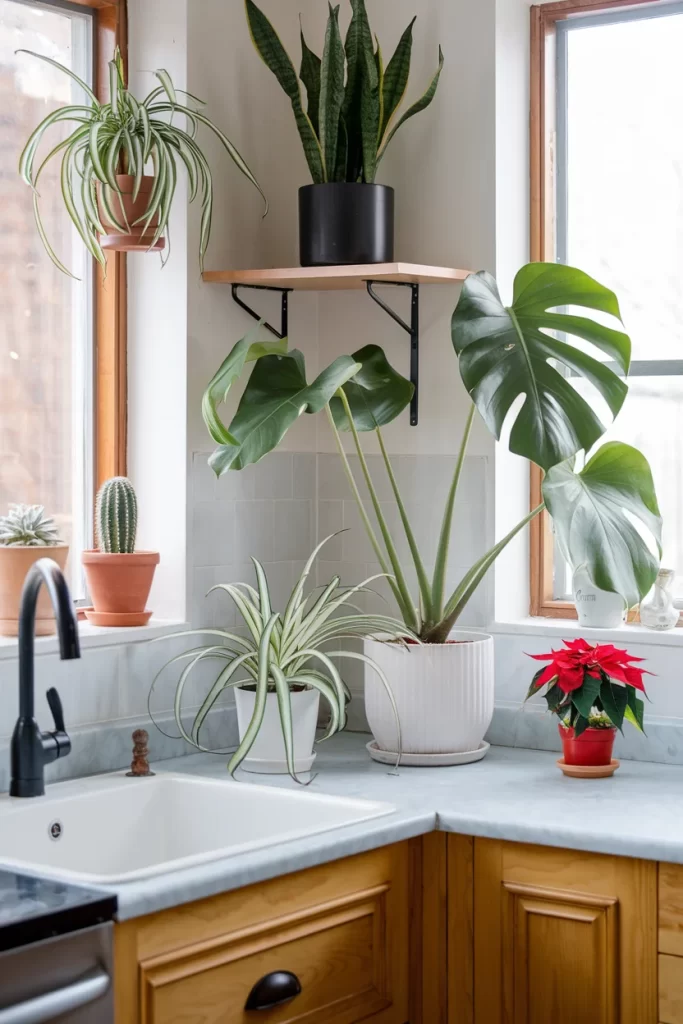 The ninth image showcases a kitchen window transformed into a plant paradise. A large monstera dominates the space while snake plants, spider plants, and small cacti create a diverse collection. The arrangement takes advantage of natural window light while adding life and color to the cooking space. The seasonal poinsettia adds a festive touch to the permanent plant collection.