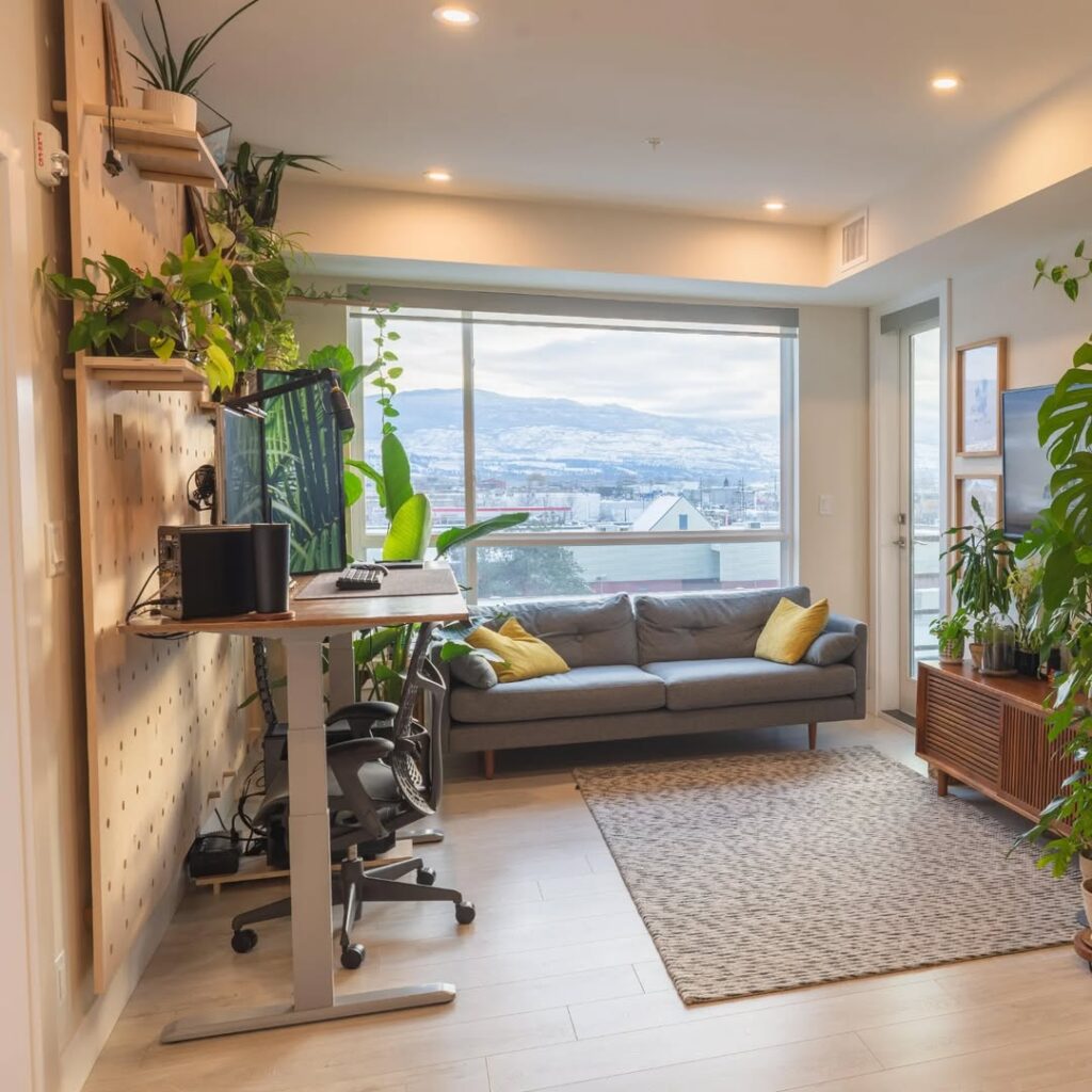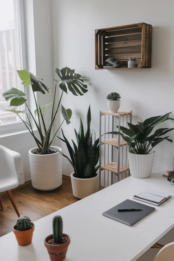 This home office setup demonstrates how to incorporate plants into functional work spaces without overwhelming the area. A large Monstera deliciosa anchors one side while a snake plant provides vertical structure in the center. A peace lily or similar broad-leafed plant balances the right side of the composition. Small cacti on the desk add personality without taking up valuable work surface. The arrangement proves that plants can enhance productivity spaces while maintaining the clean, organized aesthetic needed for focused work.