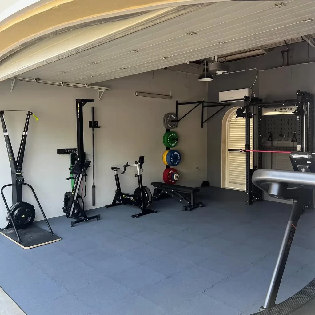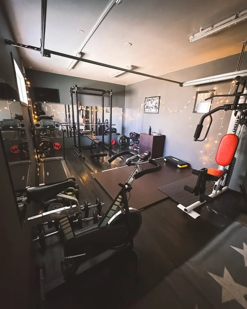 Convert your garage into a fully functional gym while maintaining vehicle storage capability. You can install ceiling-mounted storage systems that keep equipment organized overhead. The concrete floors provide exceptional stability for heavy lifting and plyometric exercises. Position major equipment along walls to preserve central driving lanes when needed. Add weatherproofing elements to protect electronics and upholstered pieces from temperature changes. Your utility costs decrease when garage doors open for natural ventilation during workouts. The high ceilings accommodate Olympic lifting and suspended training systems easily. Install proper drainage to handle sweat and cleaning water without damage concerns. Lighting becomes crucial with overhead fluorescent or LED panels for safety. You gain enormous square footage for fitness without sacrificing indoor living space. The garage location contains noise from neighbors and family members inside.