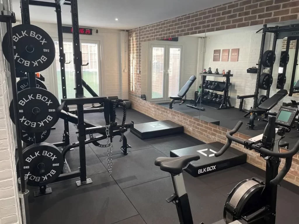 Design a bright, plant-filled space that combines fitness with biophilic design principles. You can position equipment near large windows to take advantage of natural light and views. The abundance of plants improves air quality during cardio sessions and recovery periods. Arrange living walls or hanging gardens that don’t interfere with exercise movements. Add natural materials like bamboo, cork, and jute to complement the organic theme. Your mental health benefits from the calming effects of nature integrated with physical activity. The bright environment energizes morning workouts and maintains circadian rhythm balance. Install skylights where possible to maximize daylight exposure throughout different seasons. Water features provide soothing sounds that enhance meditation and stretching sessions. You create a wellness sanctuary that addresses both physical fitness and stress management. The Instagram-worthy space motivates regular use while impressing visitors with its unique beauty.