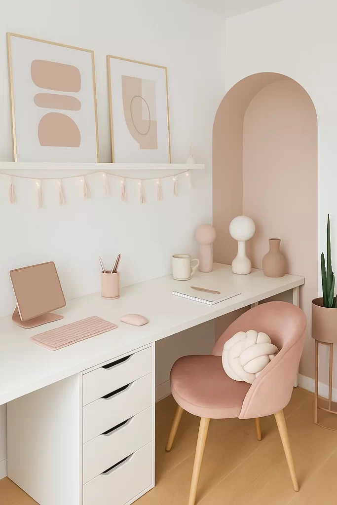 If you’re dreaming of an aesthetic Pinterest-worthy workspace, this setup nails it. With blush tones, minimalist wall art, and clean white furniture, it’s both dreamy and functional. The soft arch detail behind the desk adds architectural interest, while velvet chairs and delicate accents like tassel garlands and sculptural decor elevate the whole vibe.