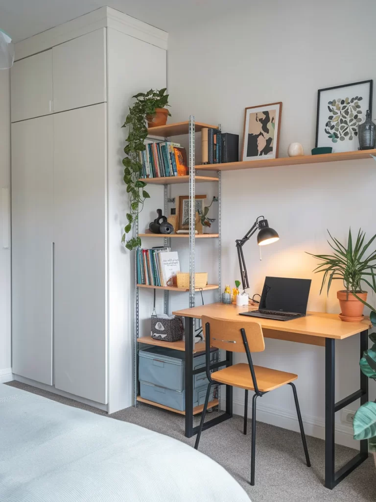 Add a cork board or peg wall above to create a personal dashboard for notes and reminders. Soft lighting—like a warm LED strip or a clamp-on lamp—adds both style and function without overwhelming the space.