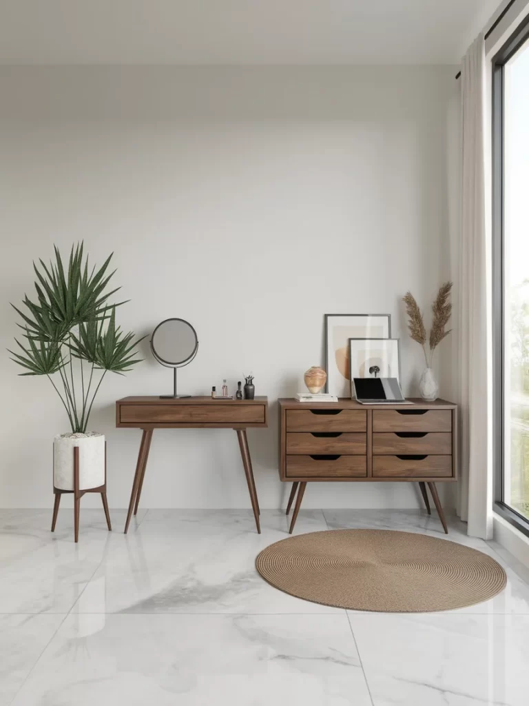 This idea thrives in glam or vintage-themed bedrooms where you don’t want a clunky office ruining the vibe. Add a plush stool or an upholstered chair to tie the look together. In the evening, your space slips back into relaxation mode without a trace of work stress.