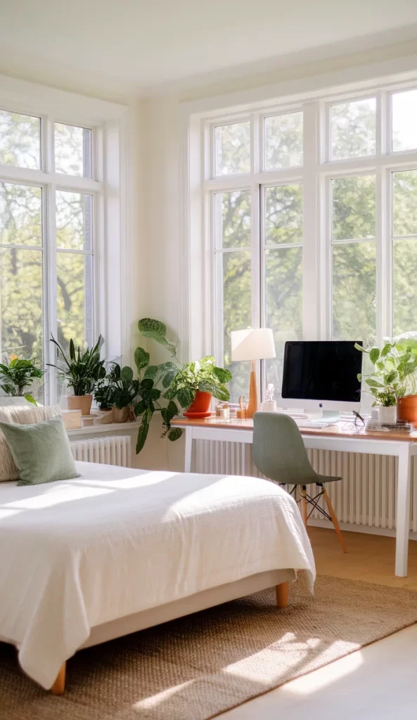 This look blends effortlessly into minimalist or Scandinavian bedrooms where light and nature take center stage. A neutral bedspread and soft rug keep things grounded, while the plants infuse life and freshness. When the day’s work is done, your space feels more like a cozy greenhouse retreat than a typical home office.