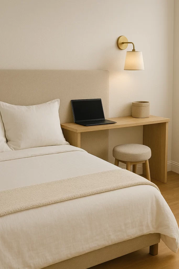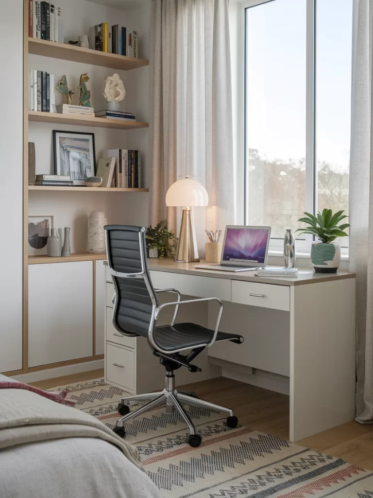Stick with light, flowing fabrics like linen or cotton to avoid making the room feel boxed in. A slim desk and wall-mounted lamp keep things functional without crowding. This setup also helps mentally separate your office zone, making it easier to switch off after hours.