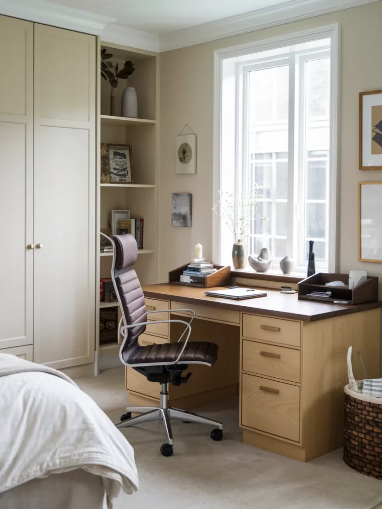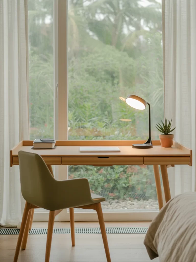 Turn your bedroom’s natural light into your productivity booster. Place a slim desk right beneath the window to keep your workspace bright and breezy. Use sheer curtains to filter harsh rays, and pair it with a neutral or glass chair that doesn’t block the view.