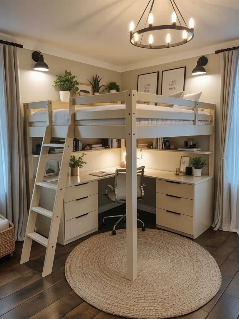 If you’re working with limited square footage, raise the bed—literally. A loft-style setup gives you space underneath for a compact office zone. Think cozy, not cramped. Use a slim desk that fits under the frame and line the wall with LED lights or floating shelves for atmosphere and storage.