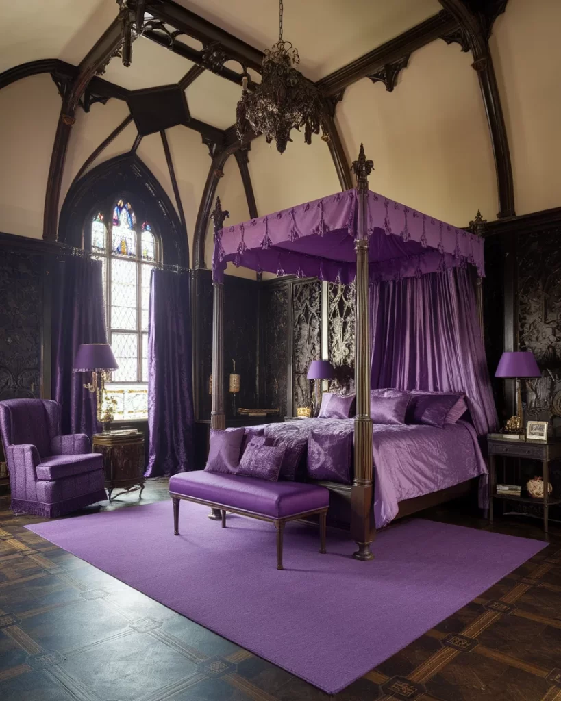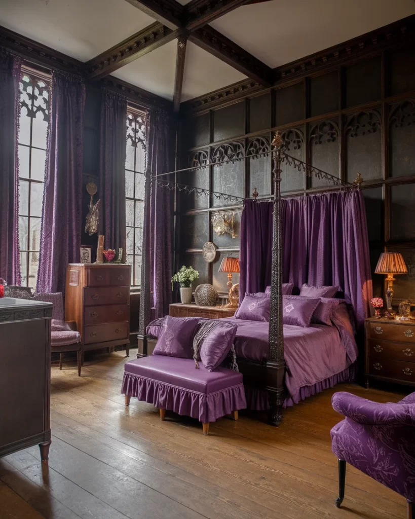 The Gothic bedroom aesthetic has evolved from its dark, brooding reputation into a sophisticated design choice that celebrates drama, history, and architectural grandeur. When combined with rich purple tones, Gothic design transforms into something truly luxurious and romantic.