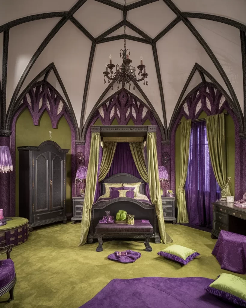 This extraordinary bedroom transforms the space into a miniature Gothic cathedral with its soaring pointed arch ceiling structure and intricate ribbed vaulting. The dramatic architectural framework creates three distinct alcoves, each featuring purple Gothic tracery that mirrors church window designs. The central bed alcove is framed by chartreuse green curtains that create a striking contrast against the purple elements, while the side alcoves house a wardrobe and window seat. The olive green carpet grounds the space, preventing the purple from overwhelming, while scattered purple floor cushions add casual comfort to the formal architectural setting.