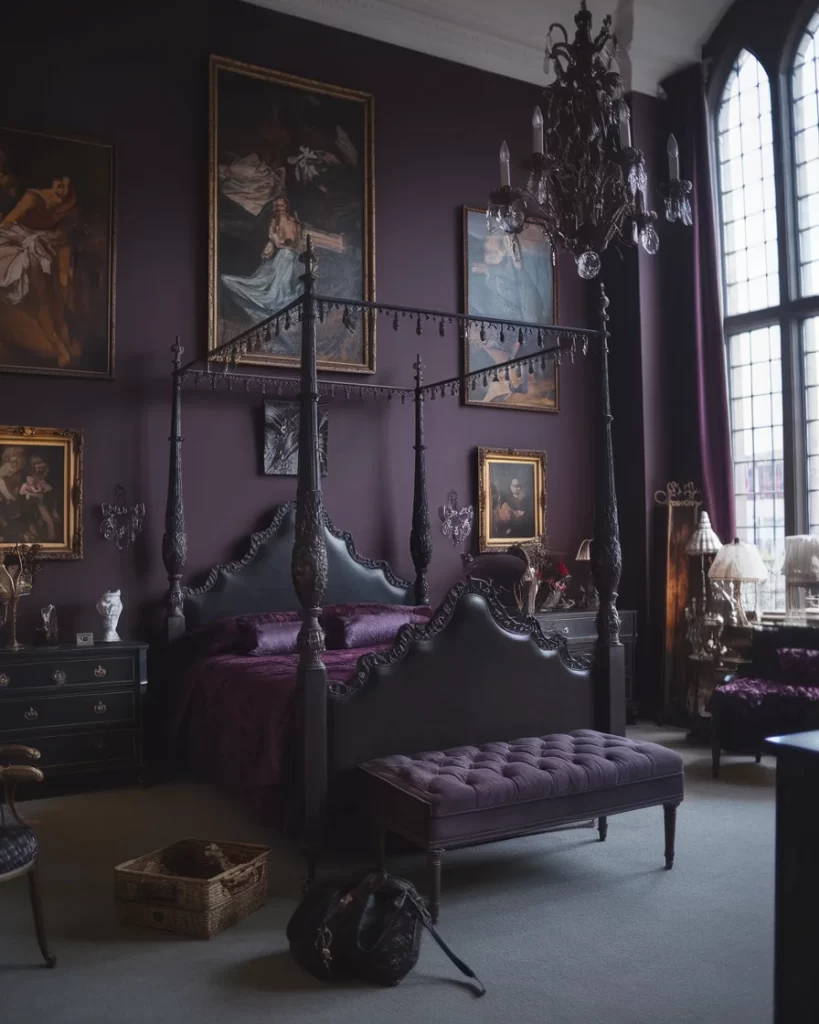 This bedroom epitomizes traditional Gothic elegance with its ornate black four-poster bed featuring intricate metalwork canopy details. The deep purple walls create a moody backdrop for classical oil paintings in gilded frames, while a dramatic black chandelier serves as the room’s centerpiece. The space balances opulence with intimacy through rich purple bedding, a tufted purple bench, and Gothic Revival architectural details. Large arched windows flood the room with natural light, preventing the dark palette from feeling oppressive.