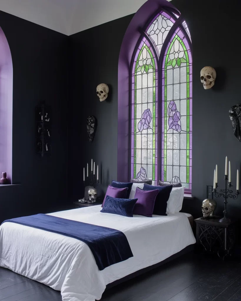 The most striking feature here is the large Gothic arched window with purple and green stained glass, creating a cathedral-like atmosphere. Dark charcoal walls provide a dramatic backdrop for the white bedding accented with purple pillows and throws. Gothic decorative elements include wall-mounted skulls and ornate metalwork, while tall candlesticks emphasize the room’s vertical proportions and ecclesiastical inspiration.