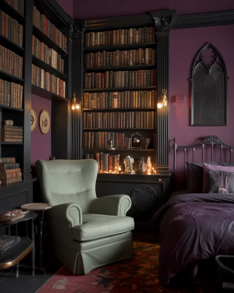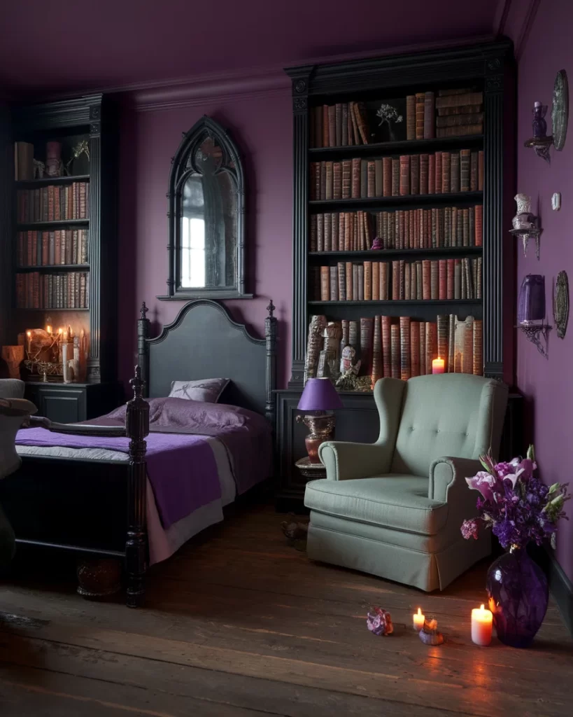 This space masterfully combines a bedroom with a library aesthetic, featuring floor-to-ceiling bookshelves filled with antique volumes. The deep purple walls create a rich backdrop for the dark wood furniture and sage green upholstered reading chair. A Gothic arched mirror adds architectural interest, while warm lighting from table lamps and candles creates an inviting scholarly atmosphere. The purple bedding coordinates beautifully with the wall color, making this perfect for book lovers who appreciate gothic elegance.