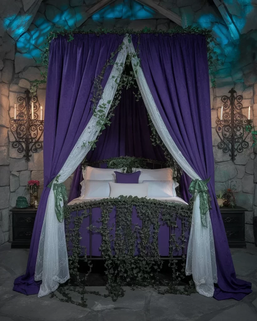 This bedroom transports you to a medieval castle with its stone walls and arched ceiling with wooden beams. Purple curtains create a dramatic canopy effect around the bed, complemented by flowing white fabric and trailing ivy for an enchanted forest feel. The rustic stone architecture contrasts beautifully with the rich purple textiles, while wrought iron wall sconces provide atmospheric lighting reminiscent of ancient castles.