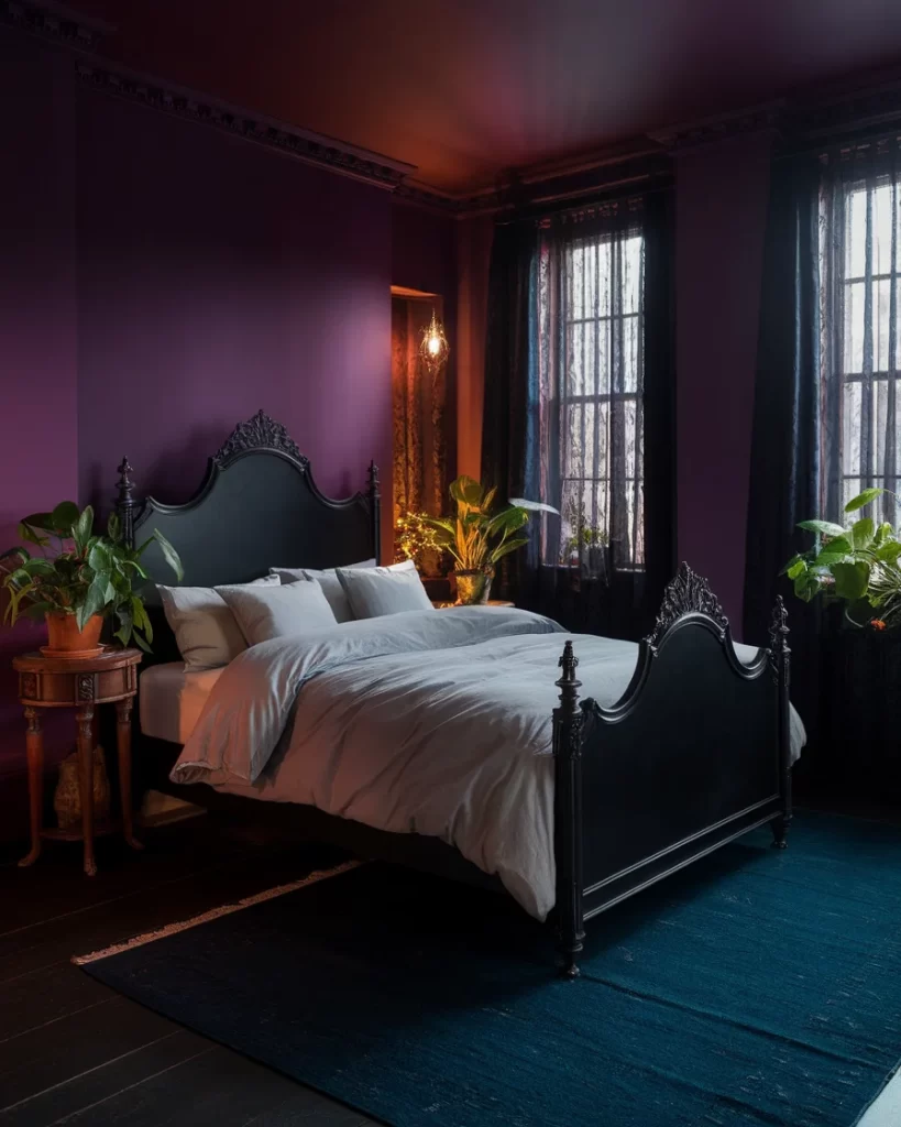 A more subdued approach featuring deep purple walls with dramatic lighting that creates an amber glow. The ornate black metal bed frame with decorative finials serves as the centerpiece, while large plants add life to the space. The combination of purple walls and warm lighting creates a mysterious, almost otherworldly atmosphere.