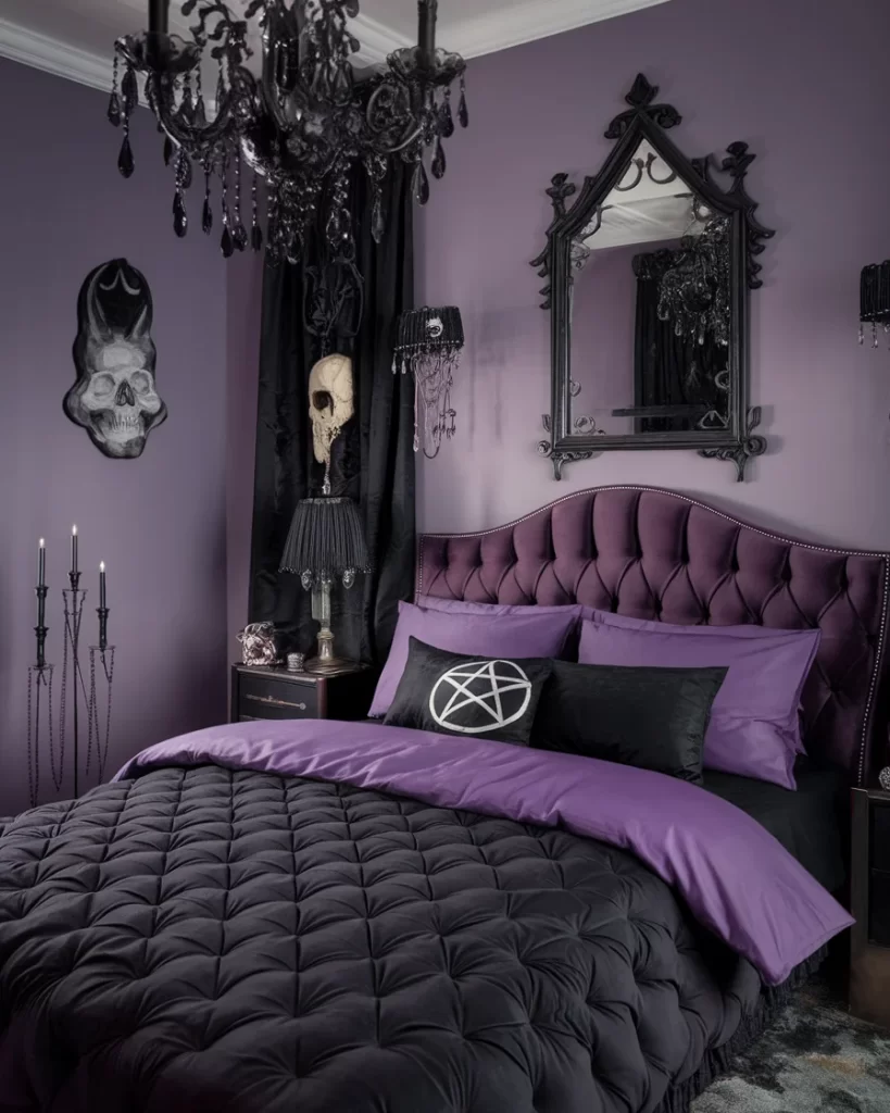 This bedroom embraces darker gothic themes with skull decorations and mystical elements. The purple tufted headboard provides a sophisticated contrast to the macabre wall art, while the black chandelier and ornate mirror maintain the gothic aesthetic. Purple walls create a cohesive color story, and the bedding featuring occult symbols adds personality. Tall black candelabras enhance the mysterious atmosphere, making this perfect for those who appreciate the darker side of gothic design.