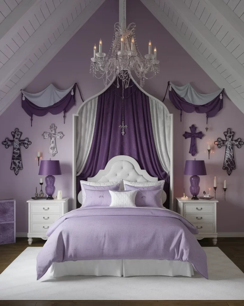 This attic bedroom showcases a softer interpretation of gothic style with a dramatic canopy bed treatment. Purple and white fabrics create an elegant contrast, while decorative crosses on the walls maintain the gothic theme. The crystal chandelier and white furniture pieces lighten the overall feel while preserving the romantic gothic essence.