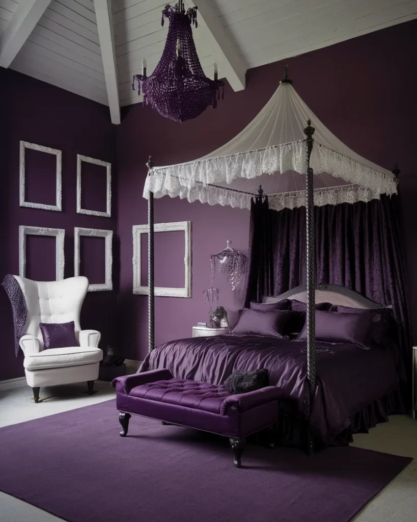 This interpretation embraces feminine Gothic romanticism with its striking purple crystal chandelier and delicate white lace canopy. The deep purple walls provide dramatic contrast to the white ceiling beams and silver-framed artwork gallery wall. A white wingback chair with purple accent pillow and matching purple chaise lounge create inviting seating areas, while the overall palette maintains the Gothic mood with softer, more approachable elements.