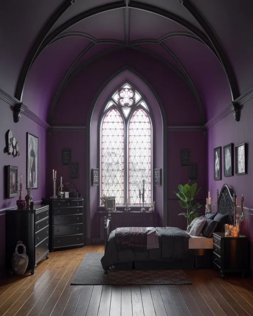 The most architecturally impressive design, featuring a dramatic vaulted ceiling with gothic ribs and a magnificent pointed arch window with tracery. The purple walls create an intimate atmosphere within the grand architectural framework. Simple dark furniture allows the stunning architectural details to shine while maintaining the gothic aesthetic.