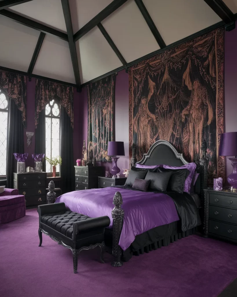 This bedroom showcases the power of textile art in Gothic design, featuring massive tapestries that dominate the wall space with their intricate medieval imagery. The exposed beam ceiling adds rustic authenticity to the refined purple and black color palette. The room demonstrates how Gothic style can be both dramatic and livable, with the purple bedding and carpet creating a cohesive color story while the black furniture provides sophisticated contrast. Purple table lamps and decorative objects scattered throughout maintain the monochromatic theme while adding layers of visual interest.