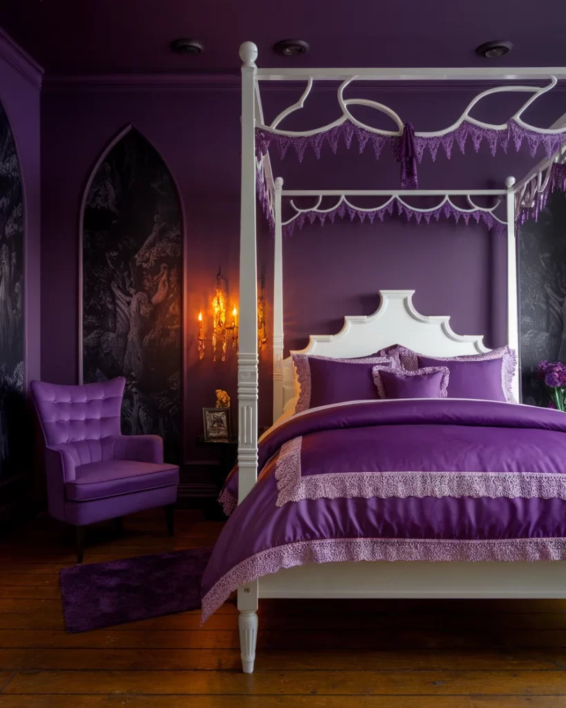 This bedroom features a charming white four-poster canopy bed with decorative purple lace trim and tassels. The deep purple walls create a dramatic backdrop, while gothic arched alcoves with dark murals add mystery. A plush purple velvet armchair and warm candlelit ambiance complete the romantic gothic atmosphere.